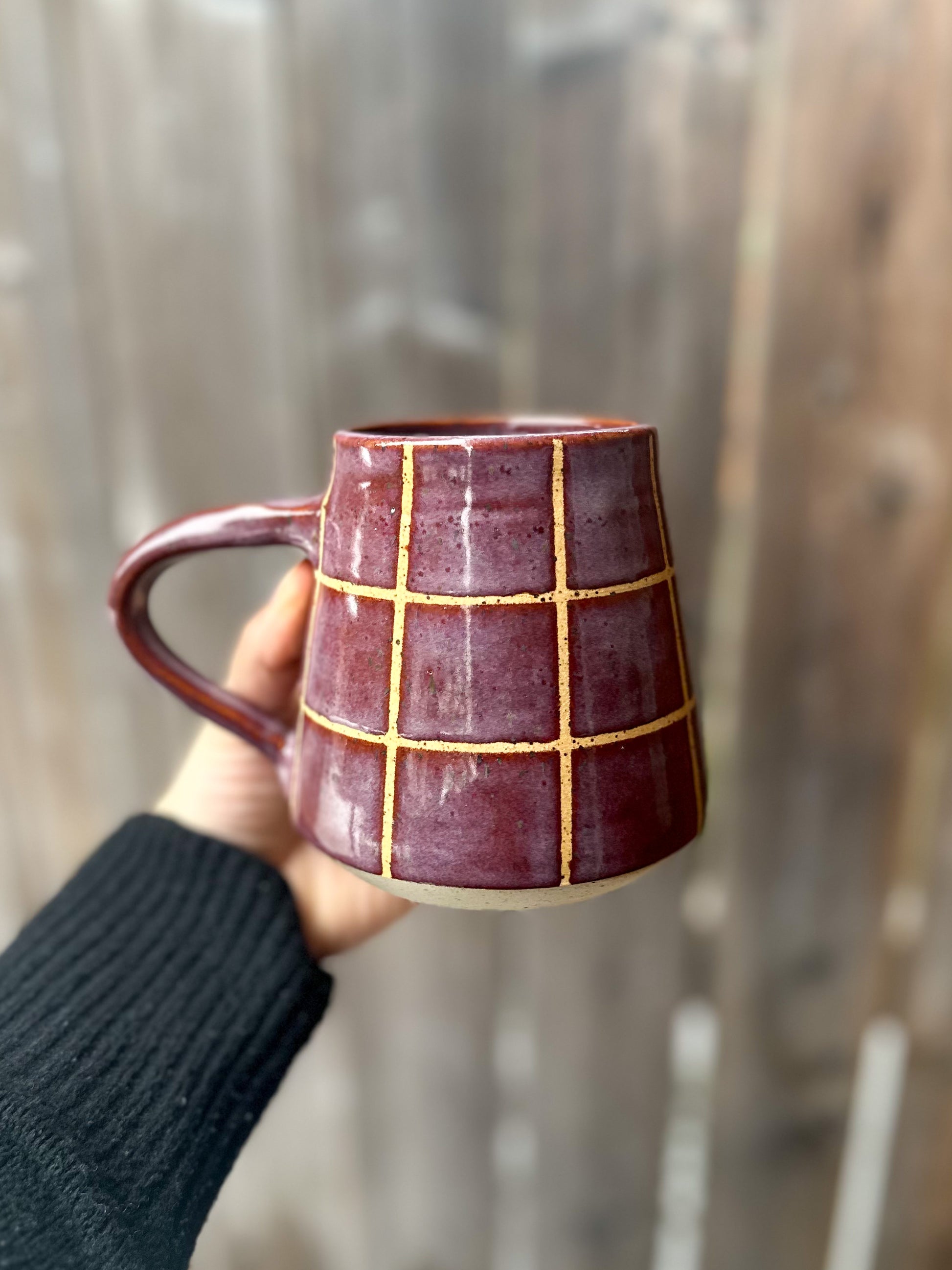Handmade mug with a tapered body to keep your drink hot for longer, and adorned with a unique handpainted grid design. Perfect for adding a touch of artistry to your daily caffeine fix!
